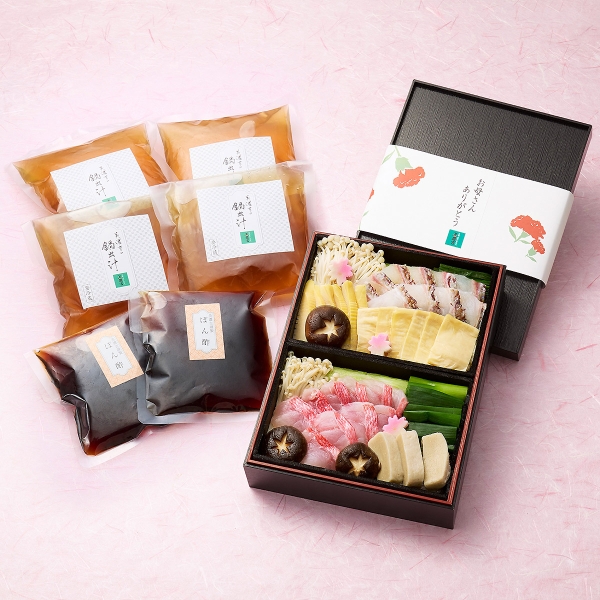 京料理 美濃吉の伝統と技術を引き継いだ料理人が、一つ一つ丁寧に調理した金目鯛と真鯛の紅白のしゃぶしゃぶ鍋です。美濃吉自慢の特製の出汁とポン酢で、母の日に是非お召し上がりください。