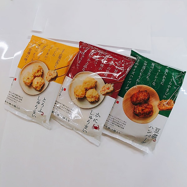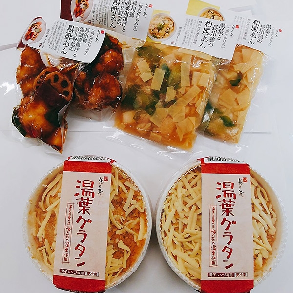 豆腐しゅうまい5コ入×1、かにしゅうまい5コ入×1、豆腐ハンバーグ5コ入×1、湯葉グラタン×2、長州鶏と彩り野菜の黒酢あん×2、湯葉と長州鶏の和風あん×2