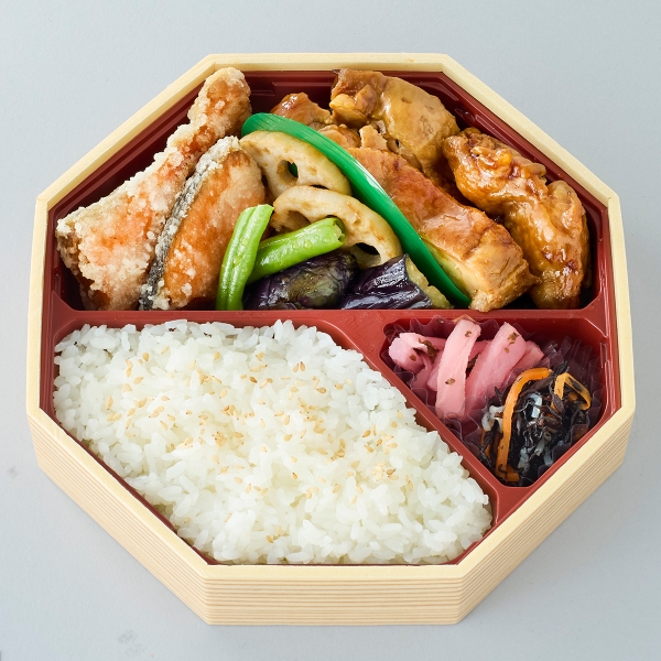 大山どりの照焼チキンと時鮭の野菜揚げのメインのおかずが2種入った、お得なお弁当をご用意致しました