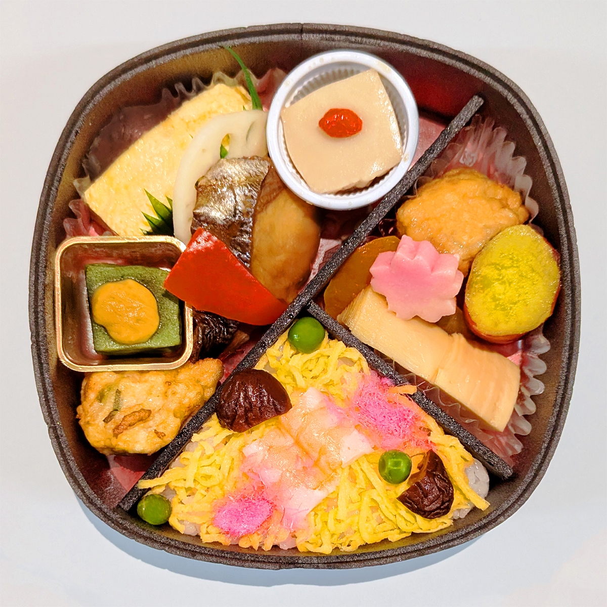 だし巻き、さわら柚庵焼き、胡麻豆腐、クコの実、酢蓮根、豆腐入りさつま揚げ(九条葱)、よもぎ麩田楽、赤パプリカ、筍煮、乱人参、野菜ひろうす、さつま芋甘煮、花麩、寿司飯、錦糸玉子、椎茸煮、桜でんぶ、海老、グリーンピース