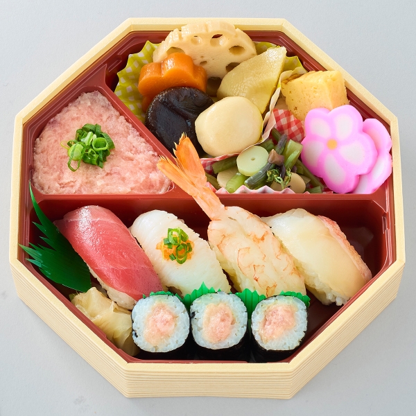 (握り)まぐろ、えんがわ、赤えび、赤魚、 ネギトロ巻、ミニネギトロ丼、煮物、花かまぼこ、山菜、かざり玉子
