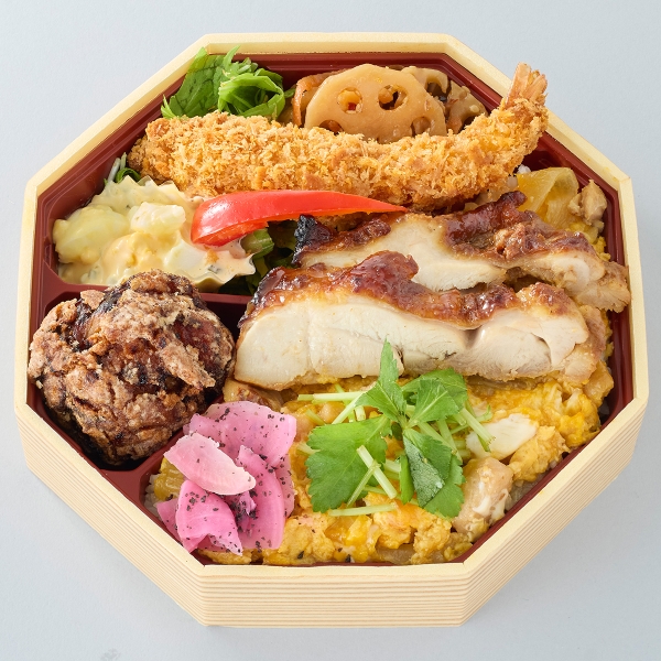 特製!みそ唐揚げ、タルタルソース海老フライ、親子煮、麹漬鶏のみそ焼き、れんこん金平