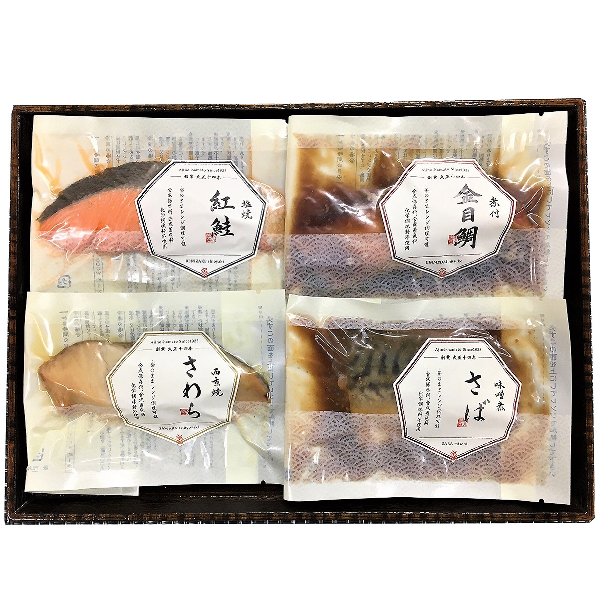 紅鮭塩焼、さわら西京焼、金目鯛煮付、さば味噌煮×各1切