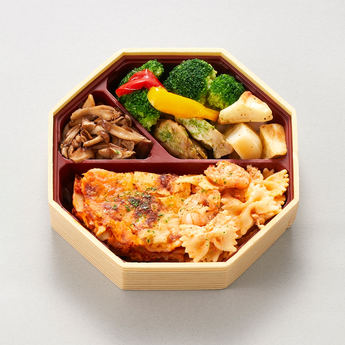 ラザーニャ・ファルファッレ エビのクリームソース・キノコソテー ・ブロッコリーとパプリカのアンチョビ風味・チキンジェノベーゼ