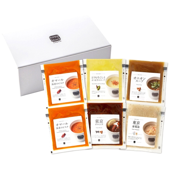 看板メニュー「オマール海老のビスク」「東京ボルシチ」などを詰め合わせました。Soup Stock Tokyoのメニューを満喫できる人気のセットです。電子レンジ対応。