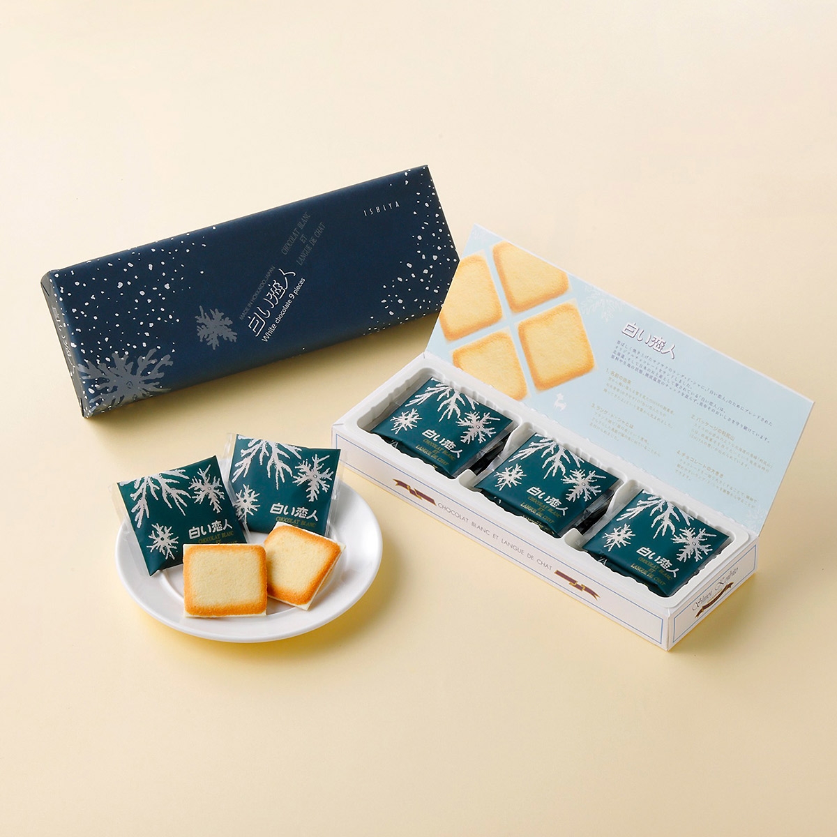 きれいな焼き色をつけたラング・ド・シャクッキーで、ホワイトチョコレートをやさしくサンド。45年以上、愛され続けてきた「白い恋人」。