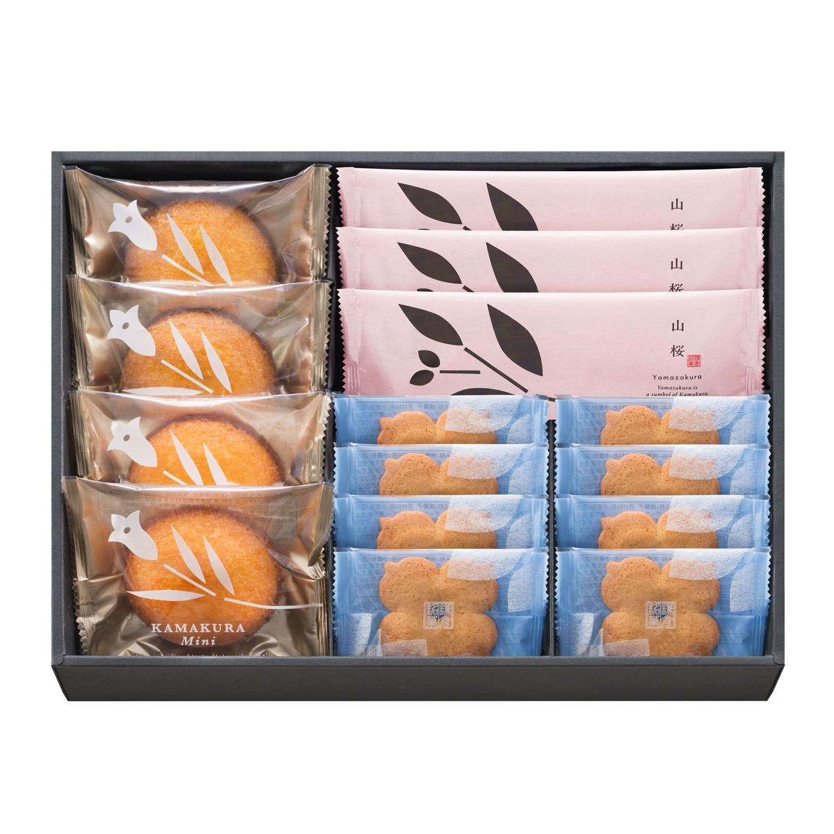 サクサクとした食感とどこか懐かしい味わい「かまくらボーロ」、サクッとした食感の「パイ山桜」、しっとりスポンジに滑らかなオリジナルクリームを詰めた「かまくらミニ」を詰め合わせました。