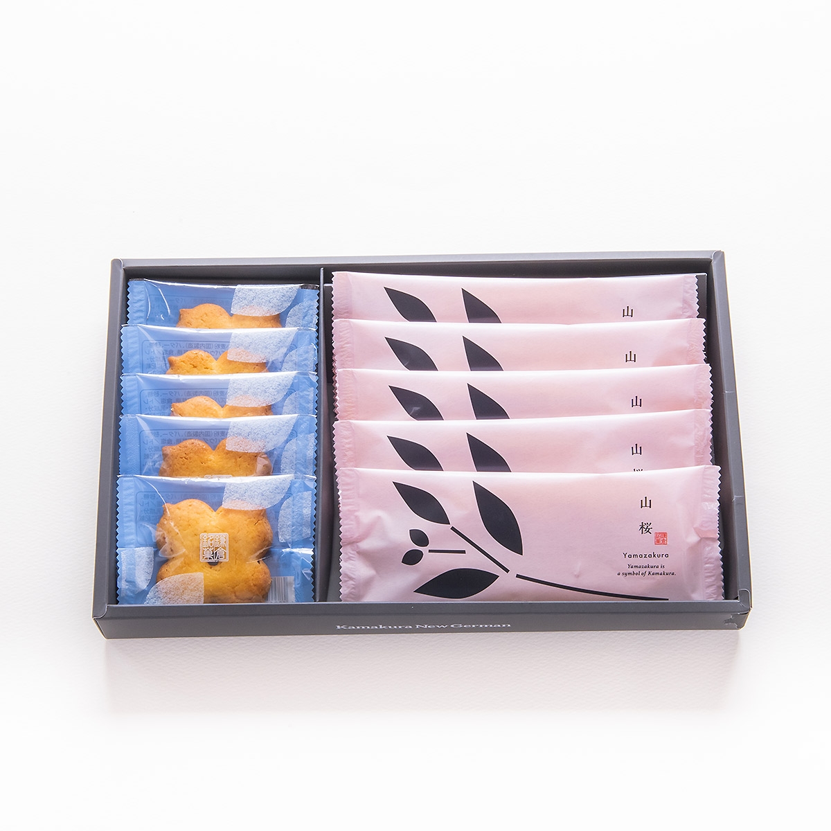 ミルキーに薫るバターと卵の風味、サクサクとした食感、あじさいをイメージした型で焼き上げた「かまくらボーロ」。サクサクとした食感のパイ山桜を詰合せました。