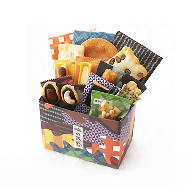 ご進物でお馴染みの「味の民芸」を、手軽に楽しんでいただけるように袋へ詰め合わせました。定番のおかきやチーズ・チョコなど個性的なおかきまで、全部で12種類のお味がお楽しみいただけます。