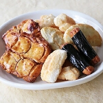 うまみたっぷりの香ばしい醤油味に海苔巻、風味豊かな青海苔やサラダの4種を、大ぶりなものから割れているものまでボリュームたっぷりに詰合せました。