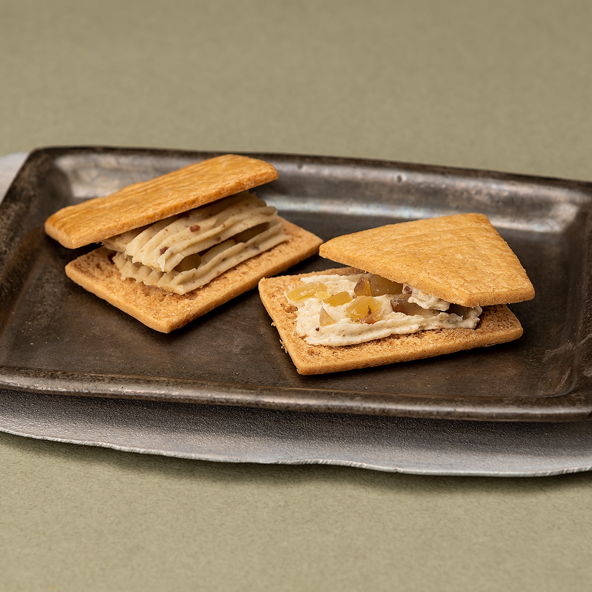 秋田県産善兵衛栗のマロングラッセの刻みとマロンクリームをタルト生地でサンドしました。
