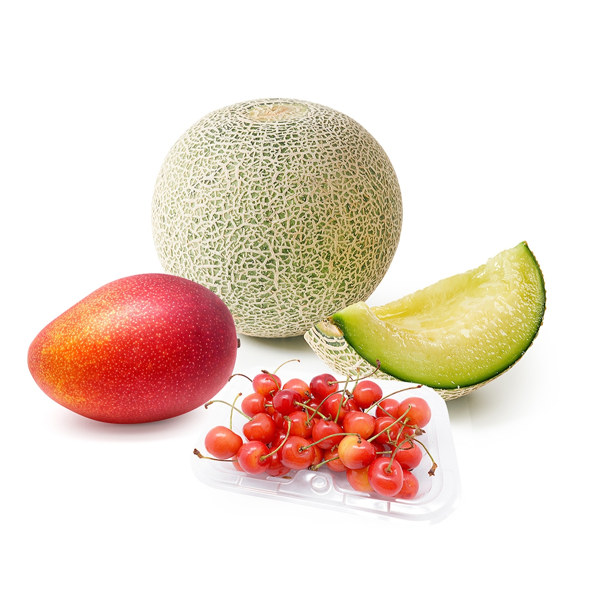 山形県産佐藤錦(約200g)×1パック、茨城県産他青肉メロン(Lサイズ)×1玉、宮崎県産完熟マンゴー(Mサイズ)×1玉