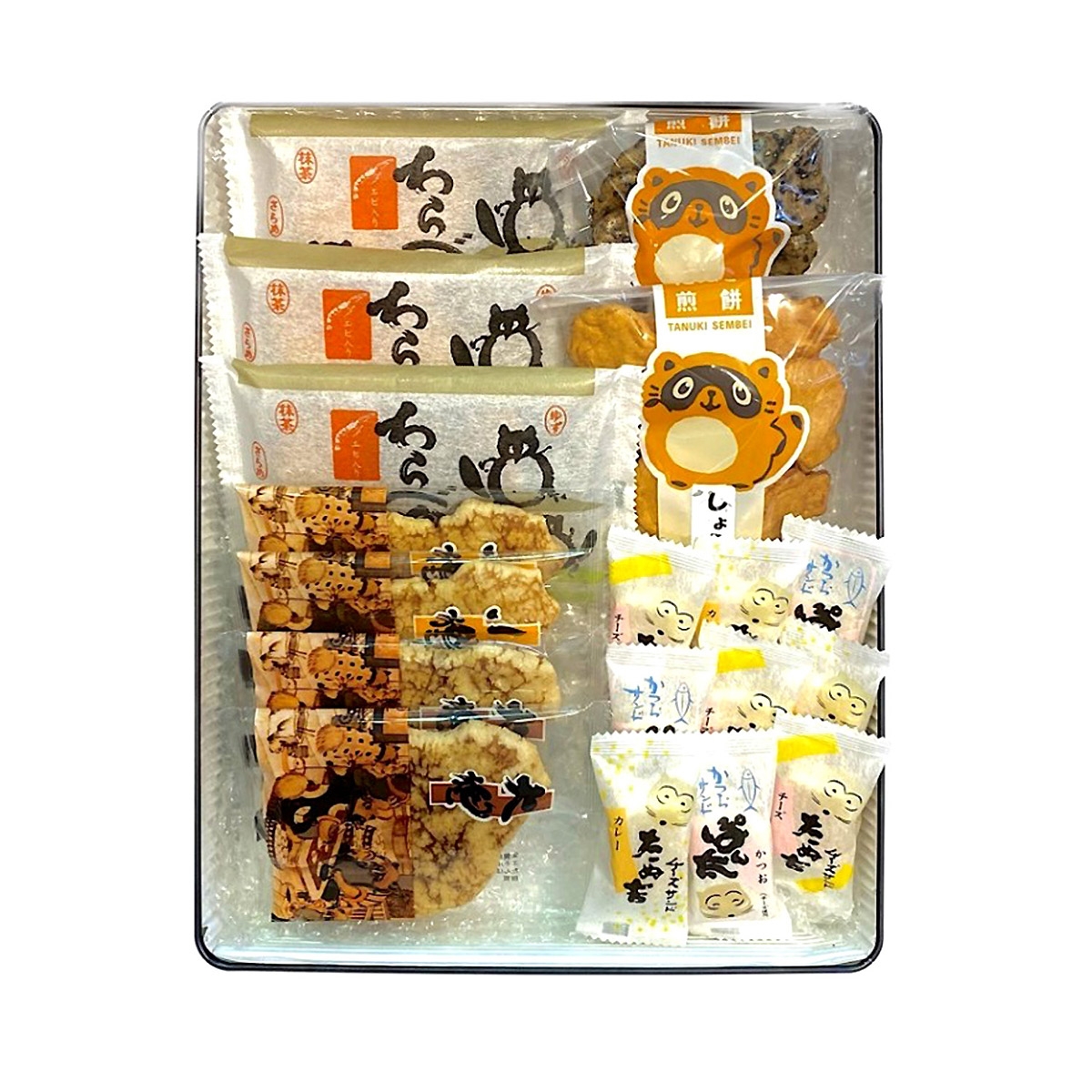 大狸や小狸をはじめ、たぬ吉、わらべ狸、しょうゆ狸などたぬき煎餅の代表的な味わいを詰合せました。伝統ある醤油の香ばしいお煎餅から、新しい風味のお煎餅まで、いろいろな味めぐりをお楽しみください。