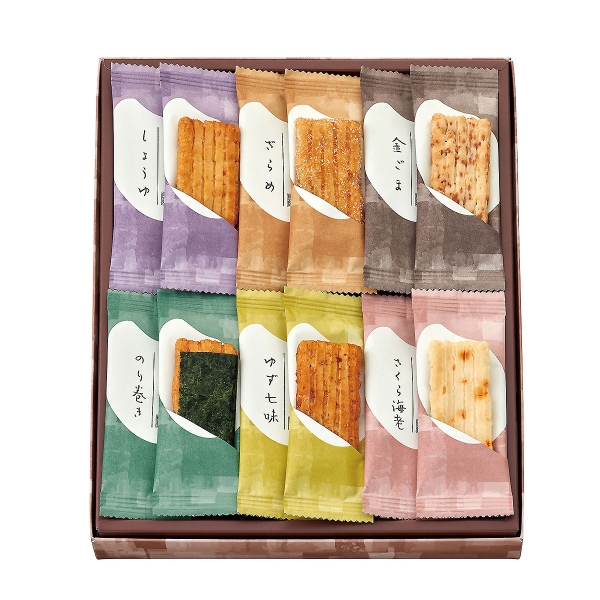 しょうゆ×3、ざらめ×3、金ごま×4、のり巻き×3、ゆず七味×3、さくら海老×4