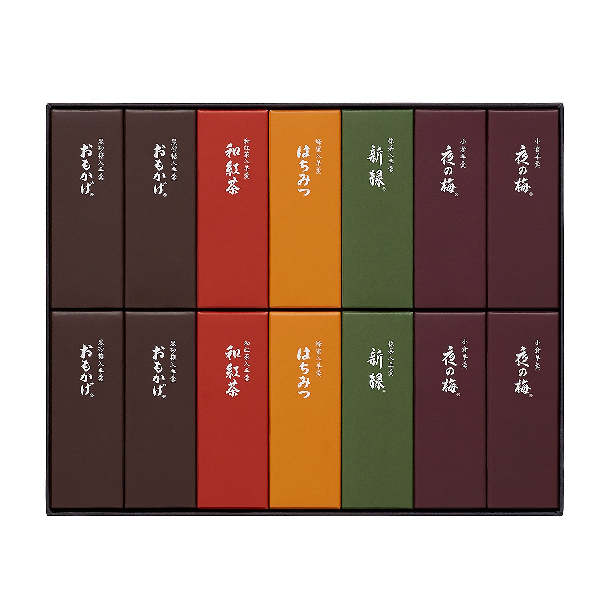 小形羊羹:小倉羊羹『夜の梅』、黒砂糖入羊羹『おもかげ』各50g×各4本、抹茶入羊羹『新緑』、蜂蜜入羊羹『はちみつ』、和紅茶入羊羹『和紅茶』各50g×各2本