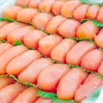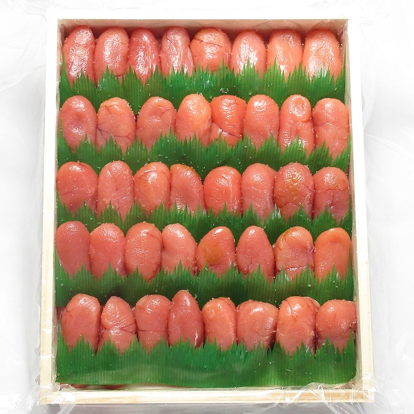 アラスカまたはオホーツク海域において、洋上船内で処理したスケソウダラ卵を瞬間凍結した鮮度の高い原卵を使用。虎杖浜の美味しい水と伯方の塩ベースで漬込みました。