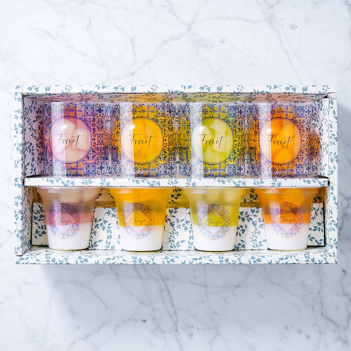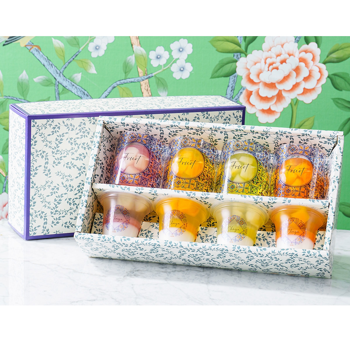 神奈川・葉山の海辺に佇む パティスリー ラ・マーレ・ド・チャヤ から、2つの涼菓を楽しめるゼリー詰合せ。果実・ピューレ・杏仁風味ゼリーを重ねた三層ゼリーは、味わいの変化が魅力。透きとおる果実ゼリーは、みずみずしい果肉とやさしい甘みが広がります。白桃・黄桃・マンゴー・洋梨の彩り豊かな4種を揃え、贈り物や夏のデザートにおすすめ。アルコール不使用でお子様にも安心してお召し上がりいただけます。