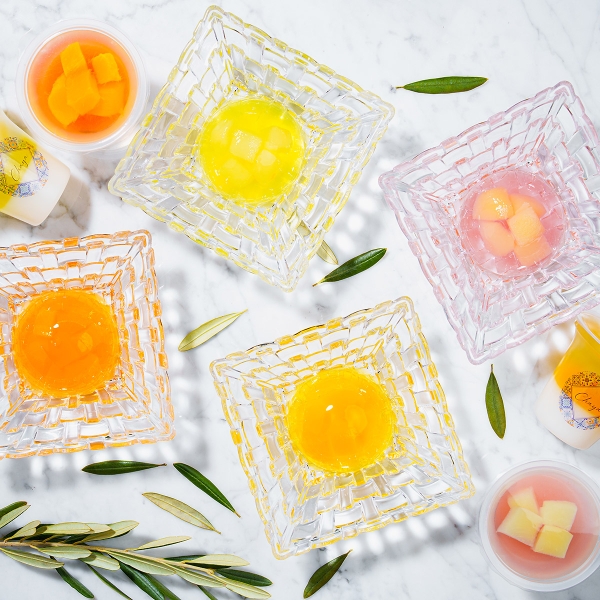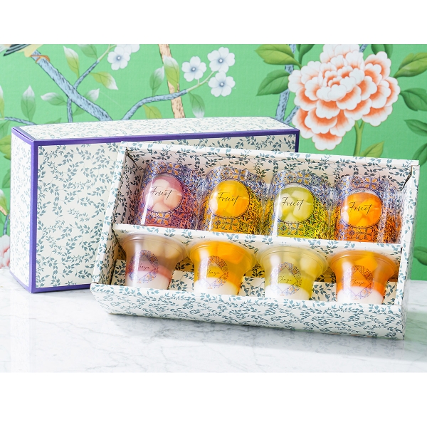 三層ゼリー(白桃・黄桃・洋梨・マンゴー)、果実ゼリー(白桃・黄桃・洋梨・マンゴー)各1
