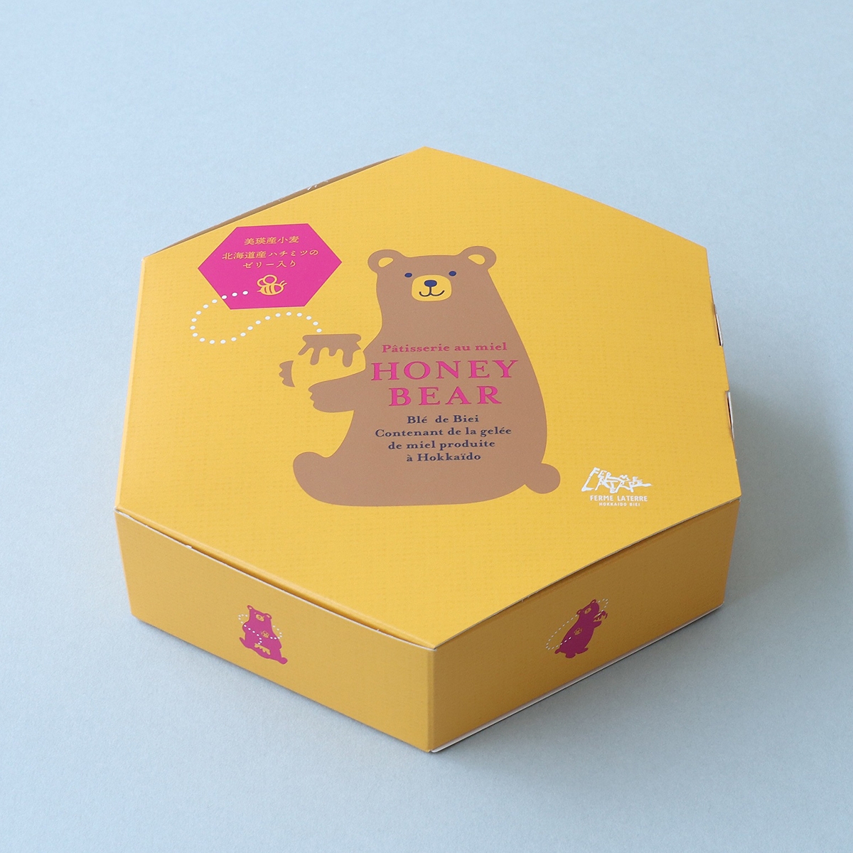 創業当初から変わらないオリジナルの型でしっとりと焼き上げたかわいらしい「クマさん」の形。中には北海道産ハチミツのゼリーが入っていて、ハチミツの甘い香りと味わいをお楽しみいただける仕上がりとなりました。