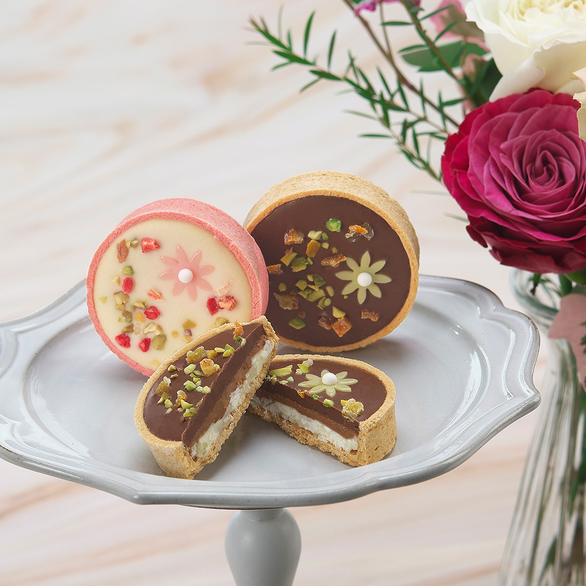 グラハムクッキー生地のサクサクのタルトにイチゴとジャンドゥーヤのフィリングをそれぞれ流し入れたかわいいタルトを2種詰め合わせました。