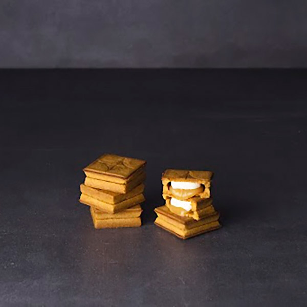 和菓子の製法「はさみ焼き」の技術で焼き上げたサクサク食感のクッキーに、濃厚なバタークリームと口どけなめらかなバターキャラメルを挟んだバターサンドです。
