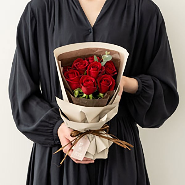 花き日持ち認証取得バラ農園ホシファームからお届けします。艶やかなベルベットのような深紅のバラ・サムライのブーケ。飾るとその存在感で空間を華やかに彩ります。まるでドレスをまとったようなふわりと重ねたフリルがかわいいラッピングでお届けします。お誕生日などの御祝や御礼などにおすすめです。深紅のバラは贈る方の思いを印象深く伝えます。