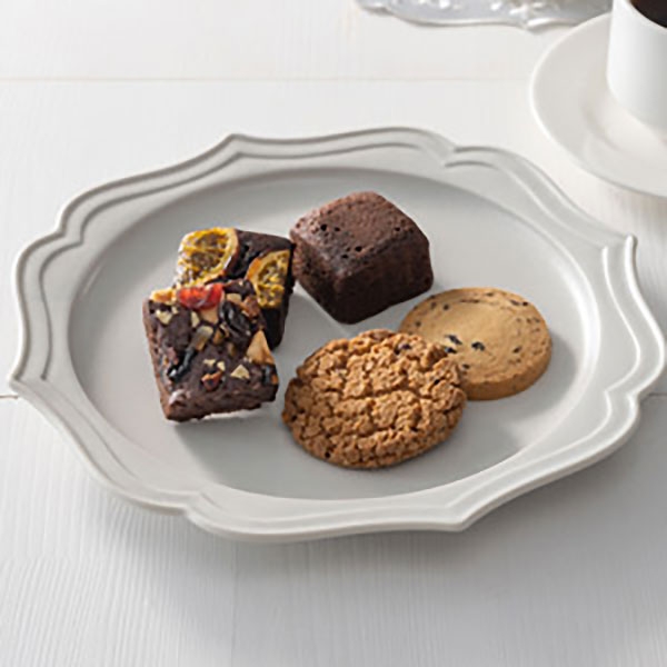 くすみ系カラーでニュアンスのある表情が魅力のテナチュールに、可愛らしいピンク系のバラを組み合わせました。まるでドレスをまとったようなふわりと重ねたフリルがかわいいラッピングでお届けします。また、一緒にセットしたスイーツは、チョコレートのほろ苦さを凝縮させたブラウニーをはじめ、5種類のフルーツとクルミをアクセントに加えたフルーツケーキなど、ホテルオークラのさまざまな焼き菓子の詰合せです。選ぶ、味わう楽しさを届けたいというホテルオークラのおもてなしの心を感じて頂けるセットとなっています。