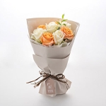 ややピンクがかったオレンジのグラデーションが幻想的なカルピジュームと、淡いグリーンを帯びた白色のアバランチェを組み合わせたブーケは、オレンジとホワイトのコントラストが爽やかな印象です。まるでドレスをまとったようなふわりと重ねたフリルがかわいいラッピングでお届けします。