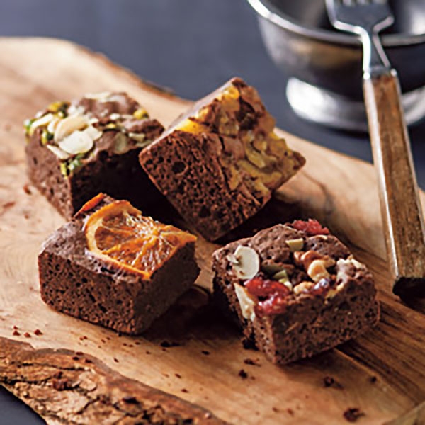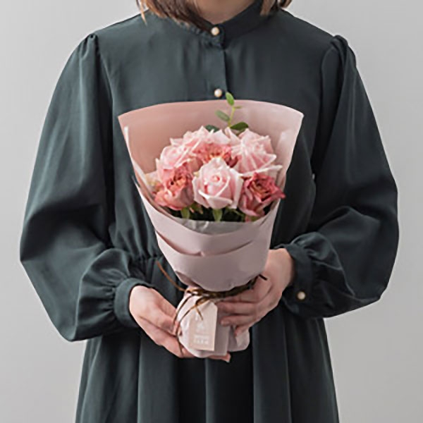くすみ系カラーでニュアンスのある表情が魅力のテナチュールに、可愛らしいピンク系のバラを組み合わせました。まるでドレスをまとったようなふわりと重ねたフリルがかわいいラッピングでお届けします。また、ブーケと一緒に、瀬戸内のフルーツ工房・ホシフルーツのナッツとドライフルーツの贅沢ブラウニーと組み合わせました。甘すぎず大人にもおすすめのちょっと贅沢なブラウニーです。大切な方の記念日に、想いを伝えたい時におすすめです。