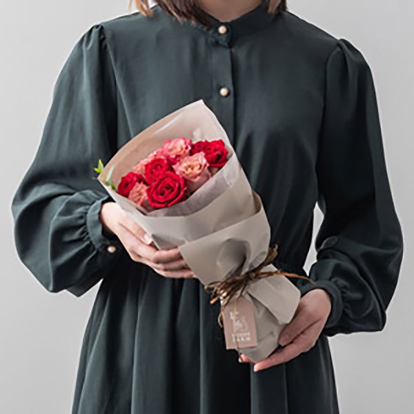 バラブーケとスイーツのコンビギフトです。艶やかなベルベットのような深紅のバラ・サムライと、シックな花色の変化が美しい「テナチュール」を組み合わせたフリルブーケ。華やかさとアンティークな雰囲気を合わせ持つ豊かな表情が魅力です。まるでドレスをまとったようなふわりと重ねたフリルがかわいいラッピングでお届けします。