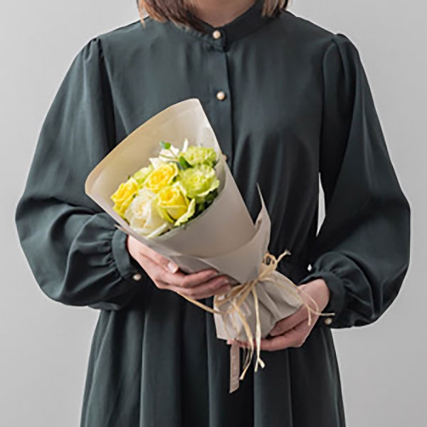 バラブーケとスイーツのコンビギフトです。明るいイエローとグリーンのバラと輝くような存在感がある白バラの瑞々しいブーケです。まるでドレスをまとったようなふわりと重ねたフリルがかわいいラッピングでお届けします。