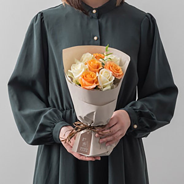 バラブーケとスイーツのコンビギフトです。ややピンクがかったオレンジのグラデーションが幻想的なカルピジュームと、淡いグリーンを帯びた白色のアバランチェを組み合わせたブーケは、オレンジとホワイトのコントラストが爽やかな印象です。まるでドレスをまとったようなふわりと重ねたフリルがかわいいラッピングでお届けします。