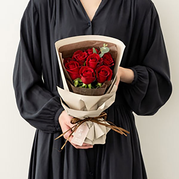バラブーケとブランドスイーツのコンビギフトです。艶やかなベルベットのような深紅のバラ・サムライのブーケ。飾るとその存在感で空間を華やかに彩ります。まるでドレスをまとったようなふわりと重ねたフリルがかわいいラッピングでお届けします。