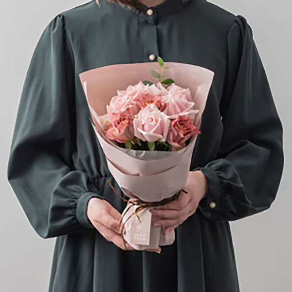 バラブーケとブランドスイーツのコンビギフトです。くすみ系カラーでニュアンスのある表情が魅力のテナチュールに、可愛らしいピンク系のバラを組み合わせました。まるでドレスをまとったようなふわりと重ねたフリルがかわいいラッピングでお届けします。