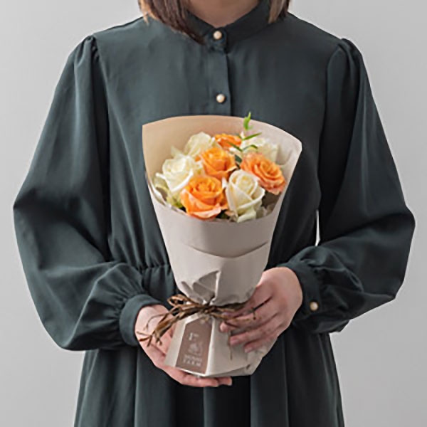 バラブーケとブランドスイーツのコンビギフトです。ややピンクがかったオレンジのグラデーションが幻想的なカルピジュームと、淡いグリーンを帯びた白色のアバランチェを組み合わせたブーケは、オレンジとホワイトのコントラストが爽やかな印象です。まるでドレスをまとったようなふわりと重ねたフリルがかわいいラッピングでお届けします。