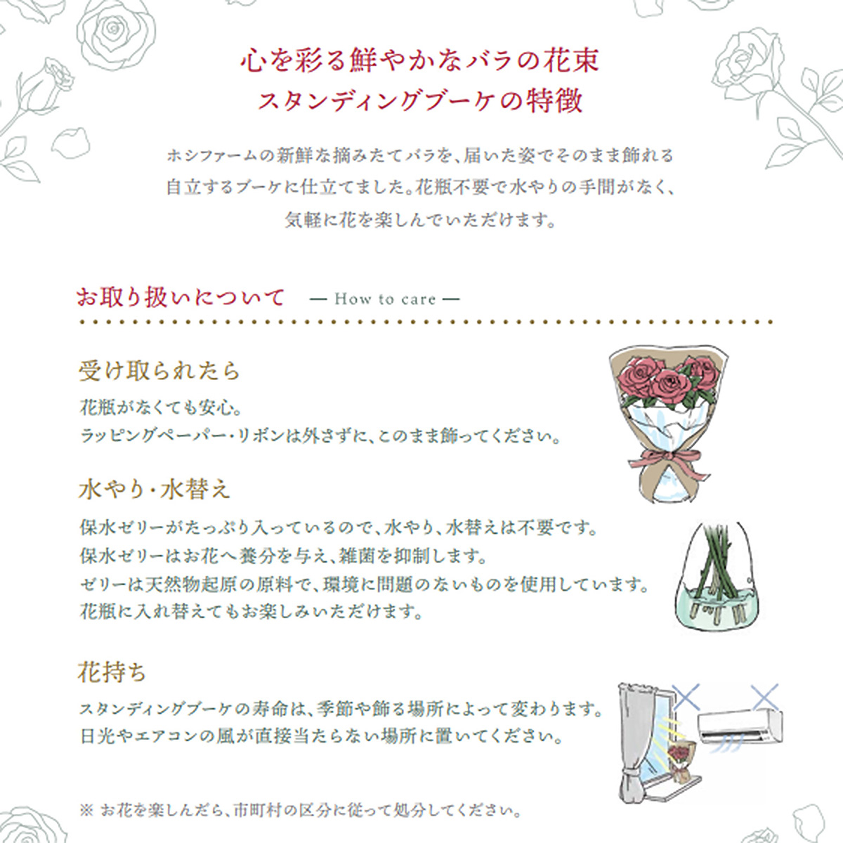ホシファームの新鮮なバラを、届いた姿でそのまま飾れる自立するブーケに仕立てました。花瓶不要で水やりの手間がなく、気軽に花を楽しんでいただけます。摘みたてのバラの中から、ギフトにおすすめなバラを選定し組み合わせた、華やかなミックスカラーのおまかせバラのスタンディングブーケです。暮らしに色どりを添えるバラに想いを託して贈られてみませんか。