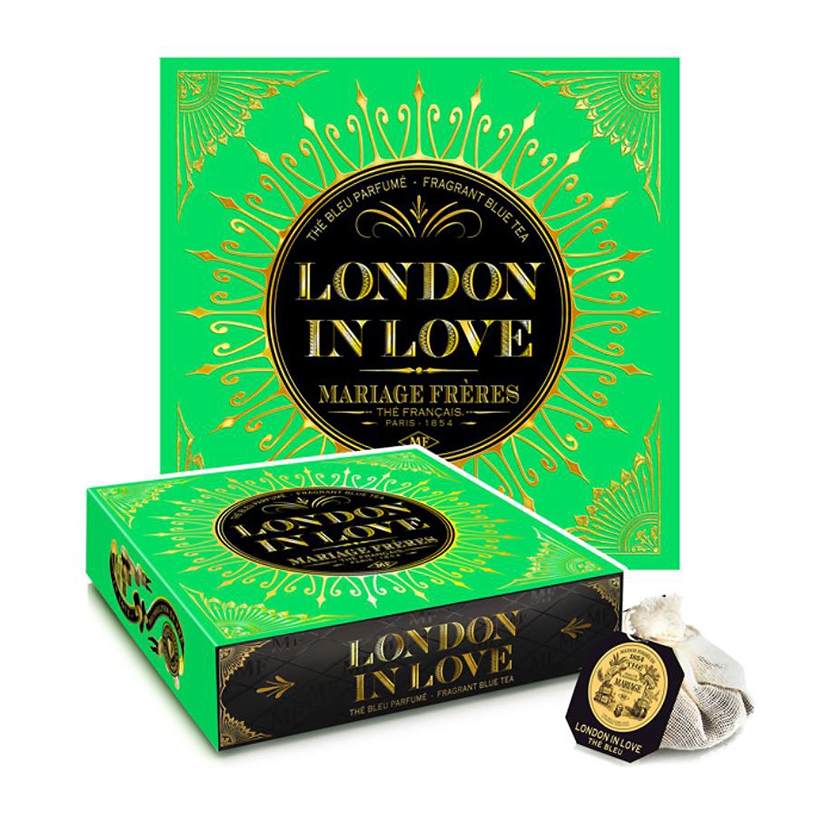 華麗なる英国的伝統へのオマージュが込められた銘柄。香り高いミントと思わず心奪われるようなラベンダーが香るブルー ティー。ロンドン イン ラヴが注がれたティー カップは壮麗なイングリッシュ ガーデンのように魅惑的なブルーの水色に彩られます。その香りは喫する者を花々が彩るイングリッシュ ガーデンに誘うかのように、鮮やかなブリティッシュ グリーンをまとい鮮やかで華麗な人々の目を惹きつけます。ひとつひとつモスリンコットンで包まれたティーバッグ。手軽に本格的な味わいが楽しめます。