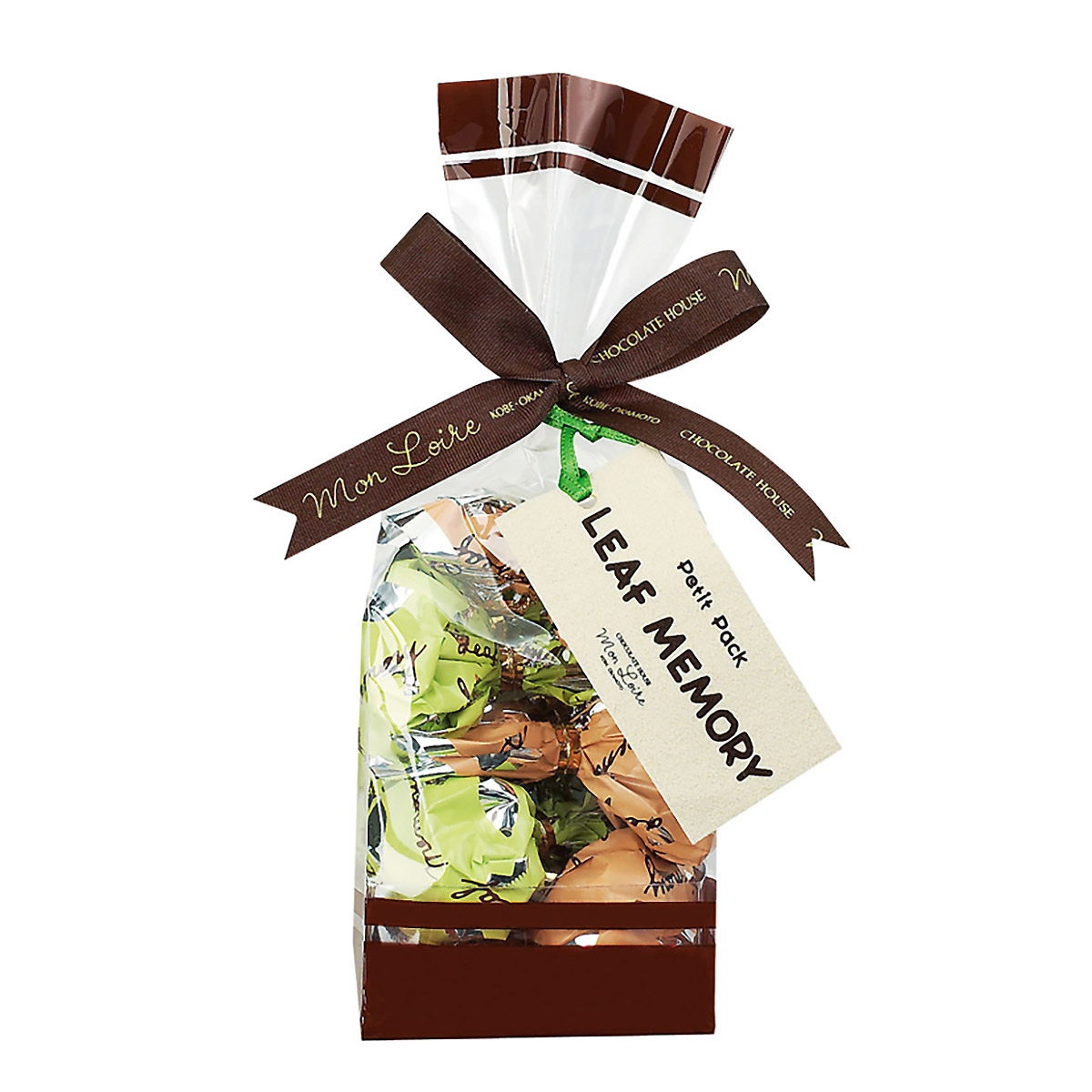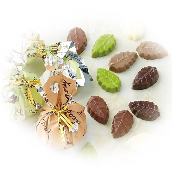 “リーフメモリー”は、木の葉の形をした小さなチョコレート。巾着の中には、それぞれ違った3つの風味のチョコレートが包まれています。口溶けよく、上品な甘さです。
