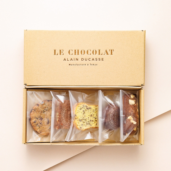 バニラ風味の生地にショコラを混ぜ込み焼き上げた優しい味のケーク、フランス産のはちみつをショコラ風味の生地に混ぜ込み焼き上げたマドレーヌ、砕いたアーモンドをトッピングしかりっとした食感もお楽しみいただける香ばしいバター風味のフィナンシェ、ピーカンナッツがアクセントのブラウニー、レーズンとショコラの粒が印象的なクッキー5種類の焼き菓子の詰め合わせです。
