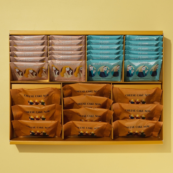 さまざまなチーズで仕立てたナウオンチーズのギフト。しっとりケイク生地の「チーズケーキナウ カマンベール&エダム」、クラシックチーズサンドより、甘じょっぱさがクセになる「カラメル&ゴルゴンゾーラ」と、スモーキーでオトナな味わいの「スモークチーズ&カマンベール」を詰め合わせました。渋谷の街並みとモチーフを使った、限定デザインです。