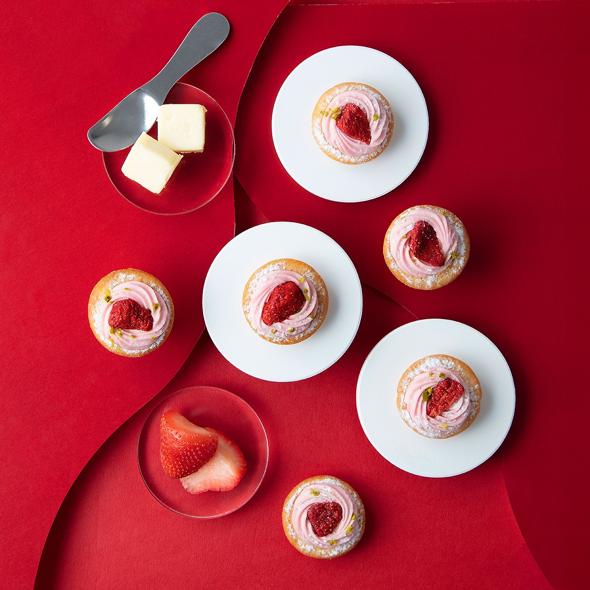 ホワイトチョコ(準チョコレート)を染み込ませたフリーズドライいちごと、ピスタチオを添えた、ドレスのチュチュのような愛らしいタルト。