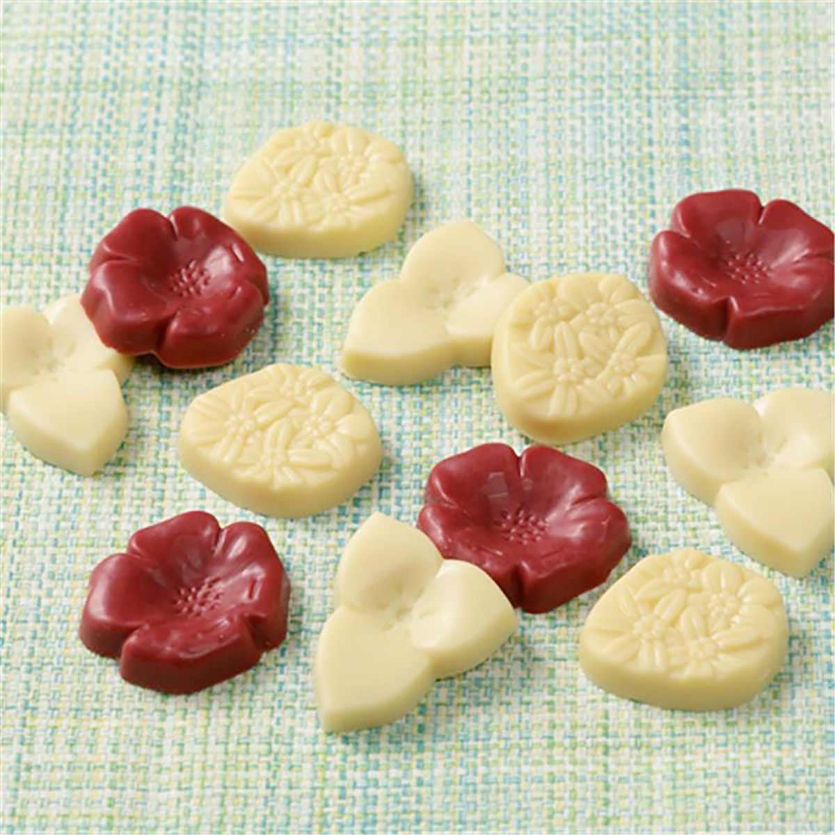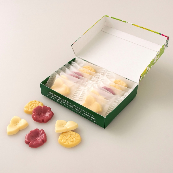 「六花の森」は、北海道に咲く山野草をかたどったチョコレート3種類の詰合せ。はまなし(ストロベリー)、おおばなのえんれいそう(ホワイト)、えぞりゅうきんか(パッションフルーツ)各4個入です。