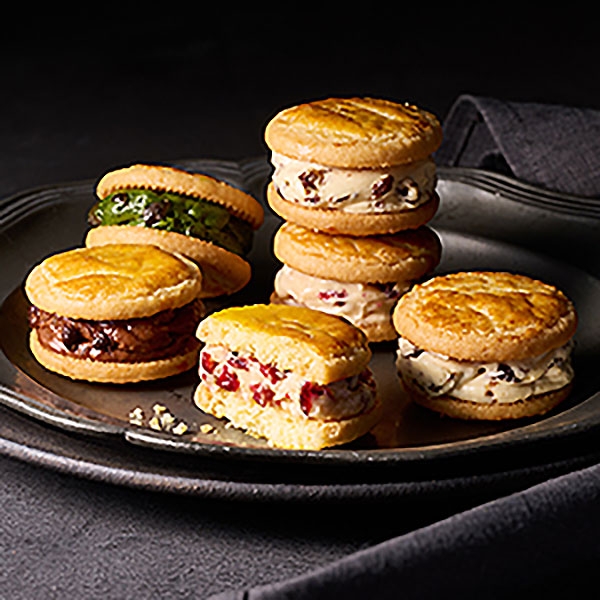 酸味のあるドライフルーツたちがほどよくマッチする、発酵バターを使用した濃厚なバタークリームを、ちょっぴり塩気のあるサクサクなクッキーでサンドしました。バタークリームの濃厚さ、ドライフルーツの量や大きさ、クッキーの食感や厚み、塩気など、パティシエのこだわりを詰め込んだ自慢のレシピで作るバターサンドです。