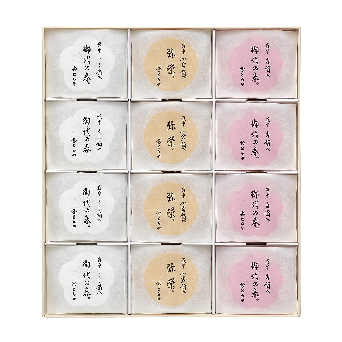 最中:『御代の春 紅』(白餡入)、『弥栄』(小倉餡入)、『御代の春 白』(こし餡入)各30g×各4個