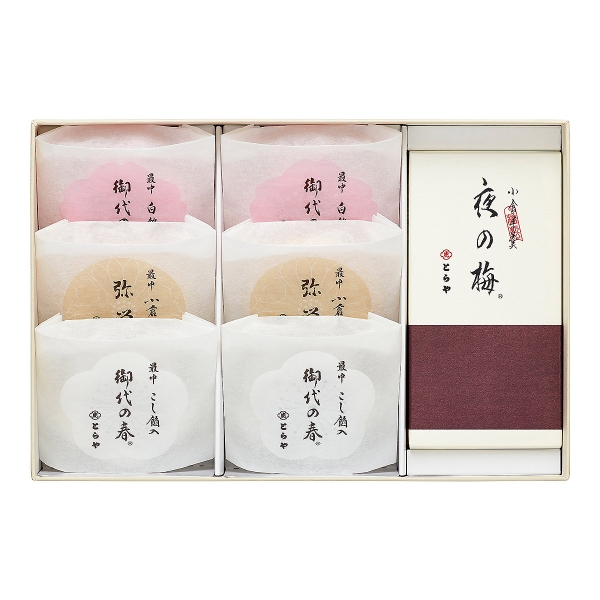 とらやを代表する小倉羊羹『夜の梅』と、桜、菊、梅をかたどった愛らしい形の最中を詰め合わせました。