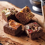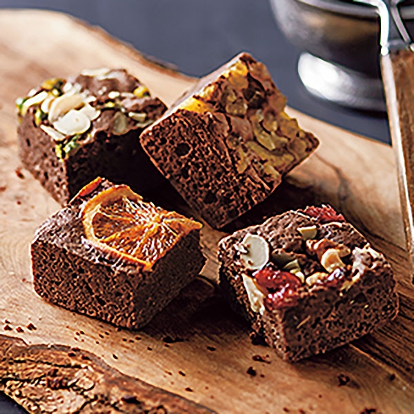 濃厚なチョコレートの生地に、香ばしいナッツや甘酸っぱいフルーツをトッピング。ピスタチオとアーモンド、ごろっとしたパイナップルやネーブル、たっぷりのドライフルーツとナッツ…。おいしさをぎゅっと詰め込んだキューブが、お口に小さなしあわせをお届けします。