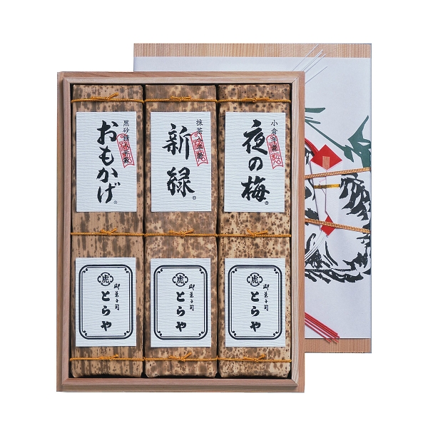 竹皮包羊羹『夜の梅』『おもかげ』『新緑』の詰め合わせです。