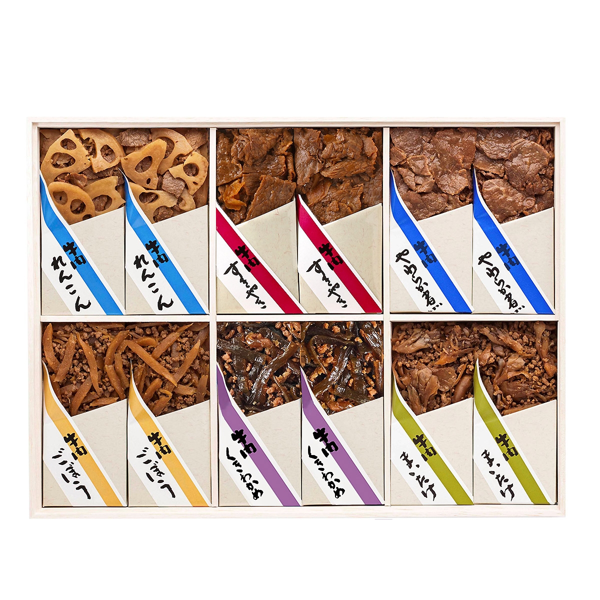 牛肉すきやき50g×2、牛肉そぼろ50g×2、牛肉ごぼう50g×2、牛肉れんこん50g×2、牛肉まいたけ50g×2、牛肉こんぶ50g×2