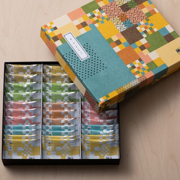 伝統工芸・寄木細工をアレンジしたモダンでカラフルなパッケージは、カジュアルながらも高級感があり、様々な手土産におすすめです。中には一口サイズのおかきを6種類詰合せました。軽い触感のおかき詰合せなので年齢問わず楽しめます。