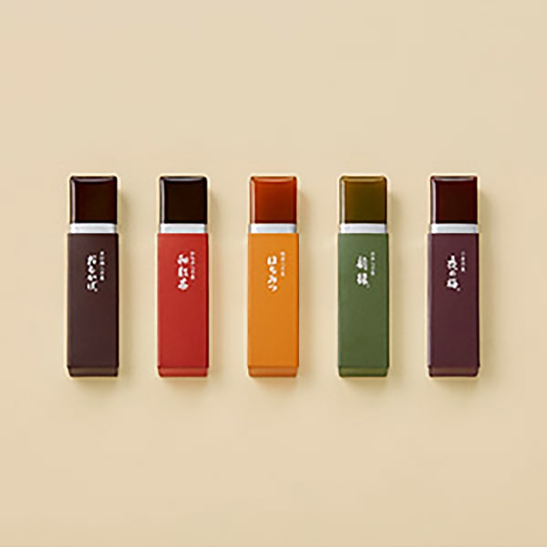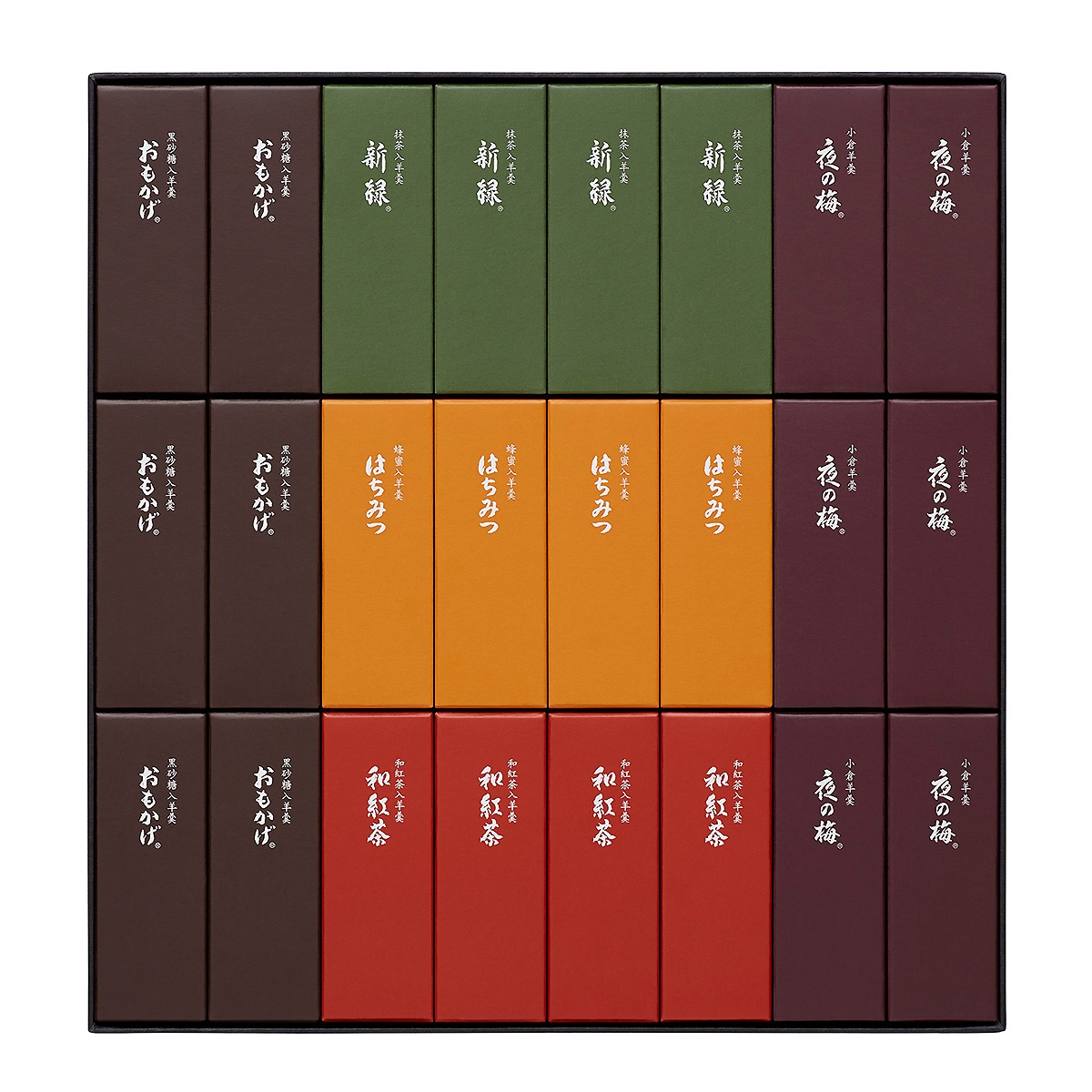 小形羊羹:小倉羊羹『夜の梅』、黒砂糖入羊羹『おもかげ』各50g×各6本、抹茶入羊羹『新緑』、蜂蜜入羊羹『はちみつ』、和紅茶入羊羹『和紅茶』各50g×各4本